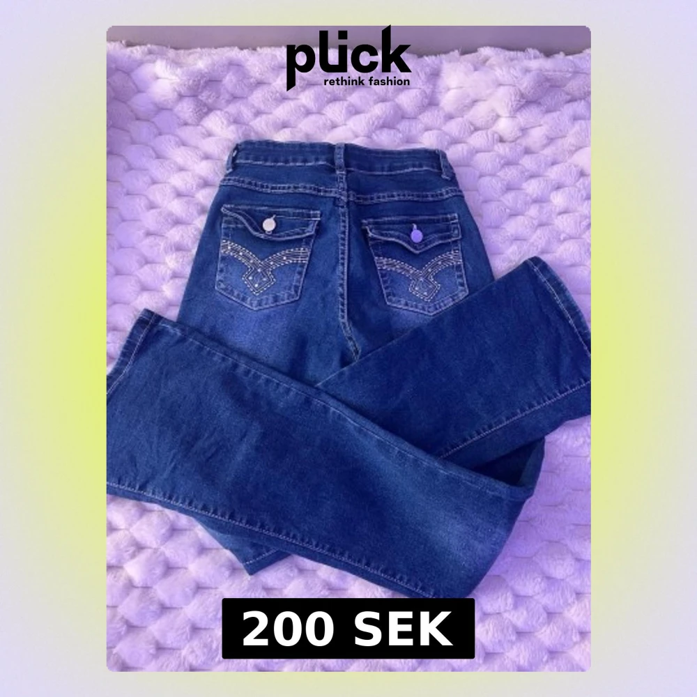 Säljer ett par mörkblå bootcut jeans med snygga broderade detaljer på bakfickorna och silverfärgade knappar. Jeansen har hög midja och klassisk femficksdesign. Perfekta för dig som gillar en retro vibe och vill sticka ut lite extra.