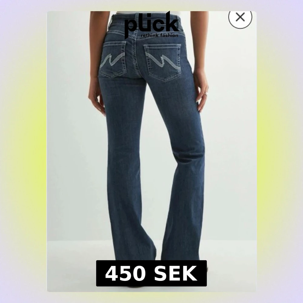 Säljer ett par mörkblå low waist bootcut jeans med vita kontrastsömmar med zigzag detalj på bakfickorna från Nelly. Har inte använt byxorna och har även prislappen fortfarande på.