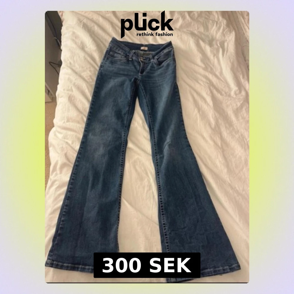Säljer ett par klassiska blå bootcut jeans med snygga broderade bakfickor. Jeansen har normal/low waist midja, dom är lite slitna nere vid benen men inget som syns jätte mycket när dom sitter på, dom är från Nelly och passar både S och M