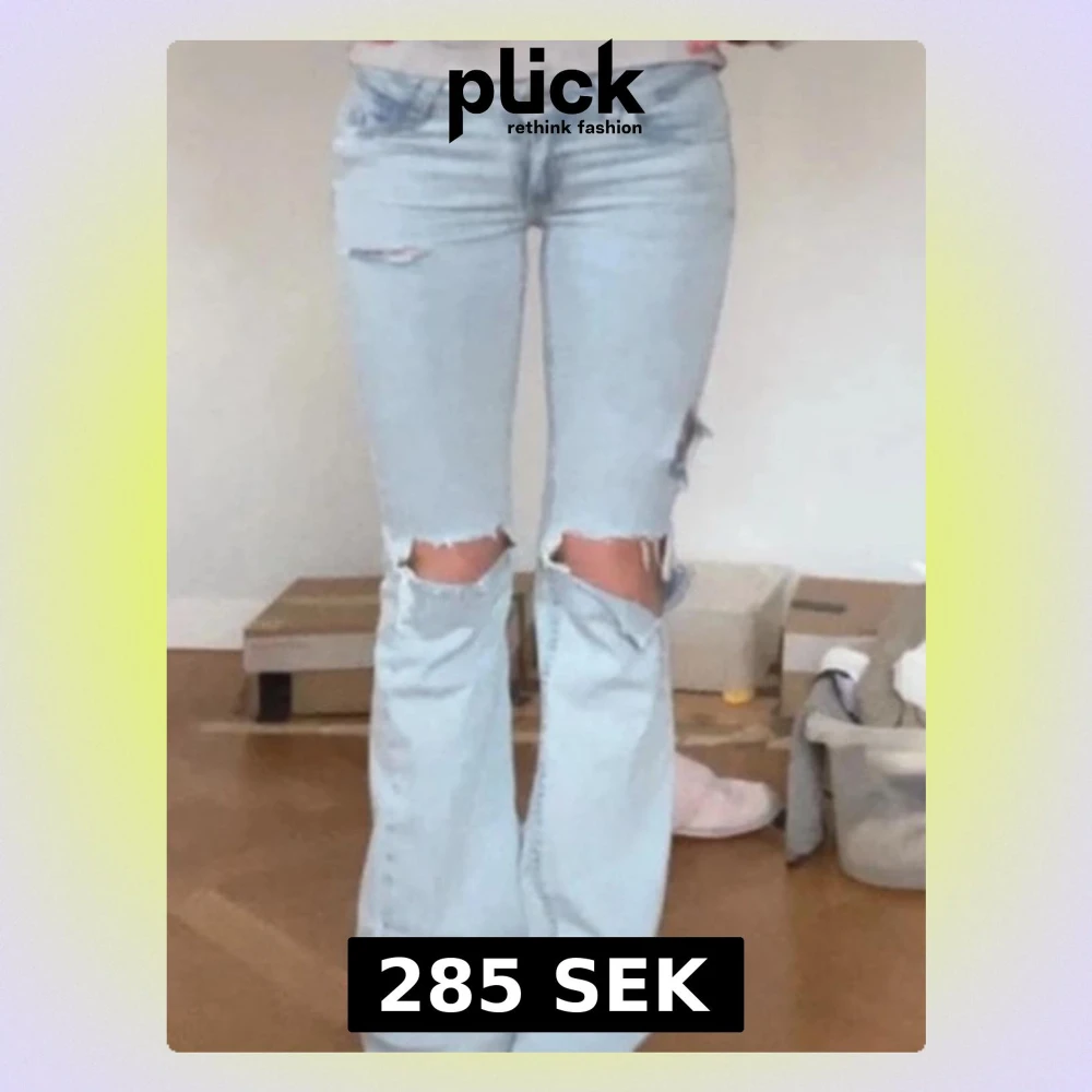 Säljer ett par ljusblå bootcut jeans med stora slitningar över knäna från Nelly