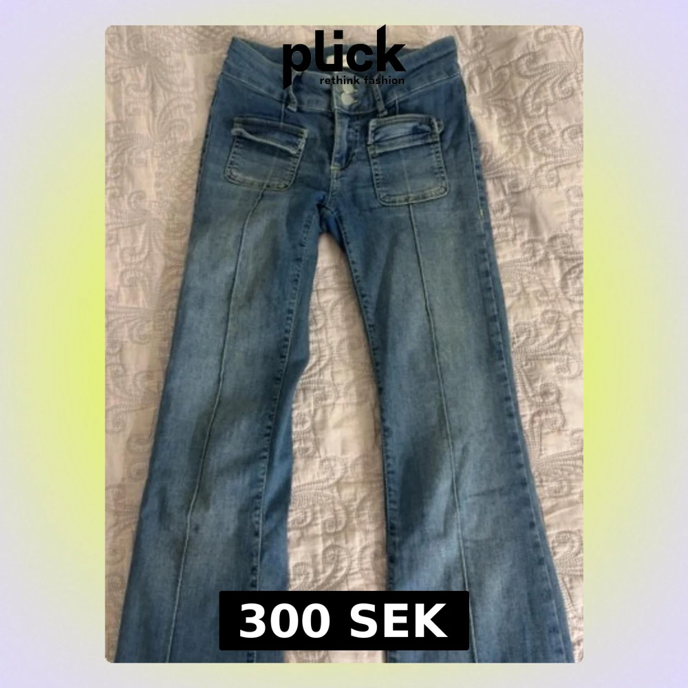 Säljer ett par ljusblå bootcut jeans från NELLY med hög midja och dekorativa sömmar längs benen. Jeansen har två stora fickor framtill och dubbla knappar i midjan. Perfekta för en avslappnad och trendig look.