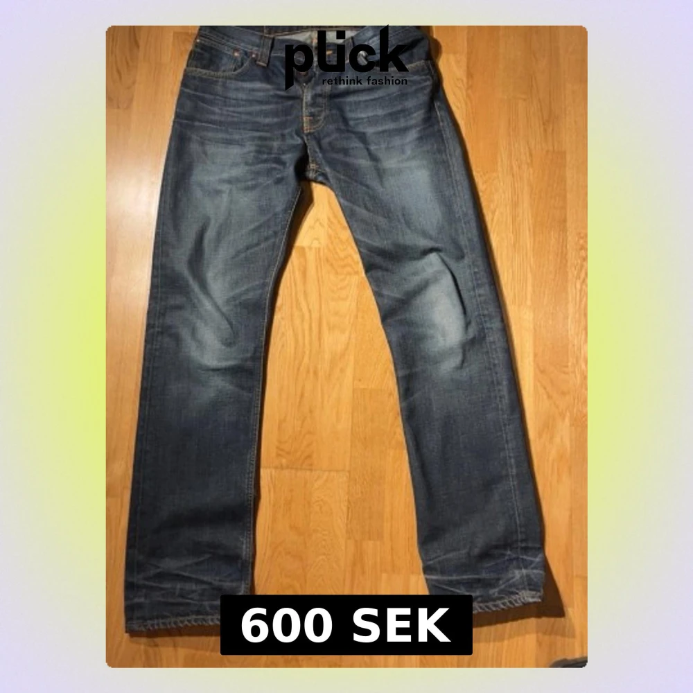 Säljer ett par klassiska blå jeans från Nudie Jeans med raka ben och snygga slitningar. Jeansen har fem fickor, orangea sömmar och är gjorda i slitstark denim. Perfekta för en avslappnad och trendig look.