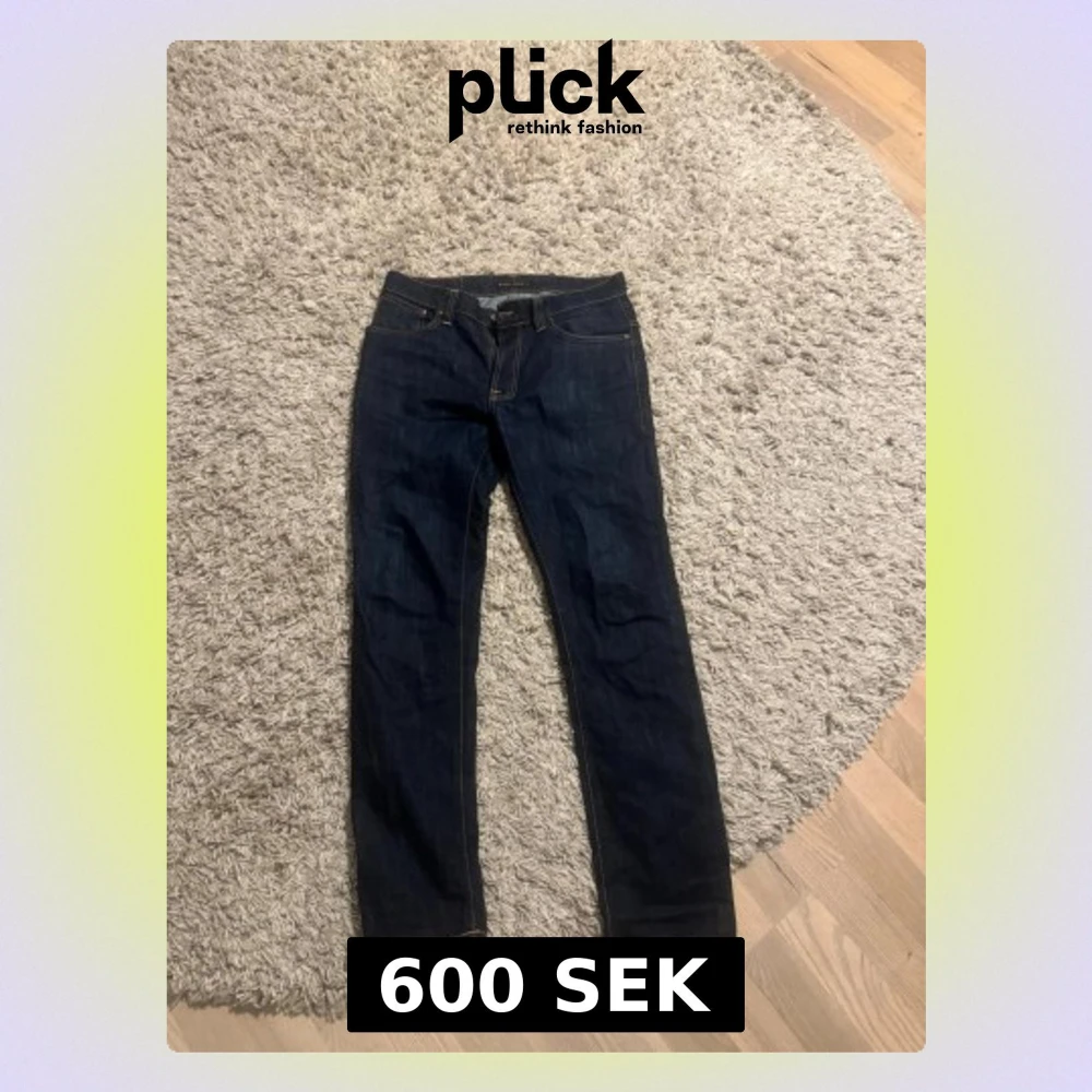 Säljer ett par mörkblå jeans från Nudie Jeans med klassisk rak passform och kontrastsömmar. Nudie Jeans signaturbroderi på bakfickorna. Tillverkade i denim med snygg tvätt och detaljer. Storlek w34 l32