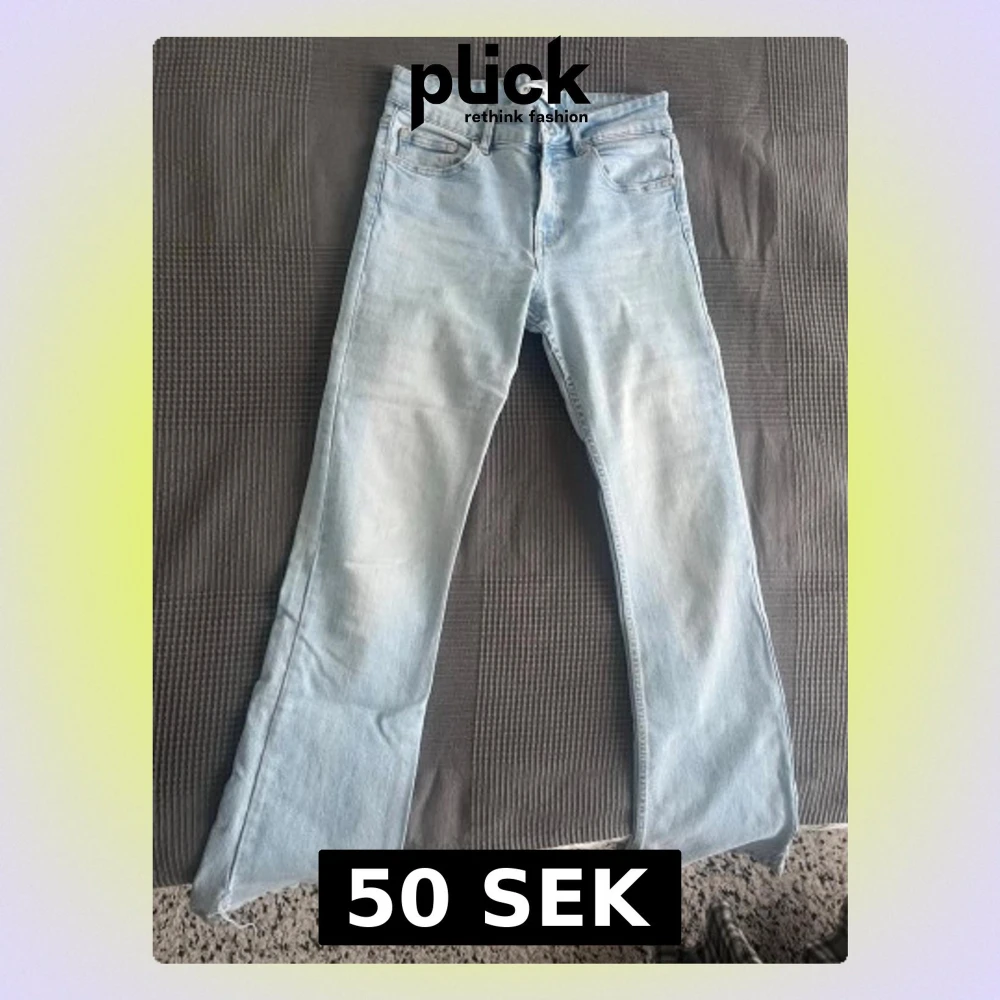 Säljer ett par ljusblå jeans med utsvängd passform från Pull & Bear i storlek 36. Jeansen har en snygg tvättad look och är tillverkade i denim.