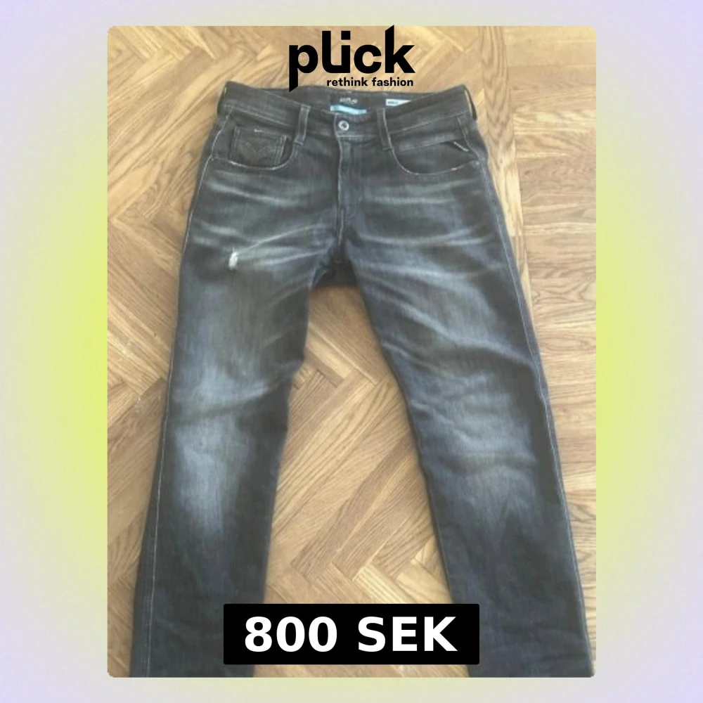 Säljer ett par svart/gra slim fit jeans från Replay med snygga slitningar och tvättade detaljer. Jeansen har klassisk femficksmodell, knappgylf och en slim fit passform . Perfekta för dig som gillar en avslappnad men trendig stil. 29/30