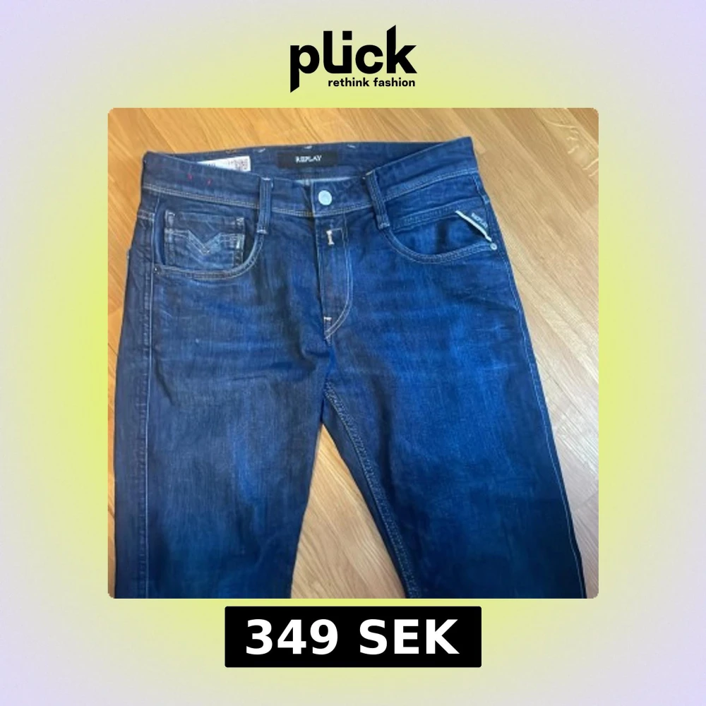 Säljer ett par snygga blå jeans från Replay, modell Anbass i slim fit. Klassisk femficksdesign med detaljerade sömmar och logga på fickan. Jeansen har en djup indigo färg och är tillverkade i ett mjukt denimtyg som sitter riktigt bra. Endast använda fåtal gånger.