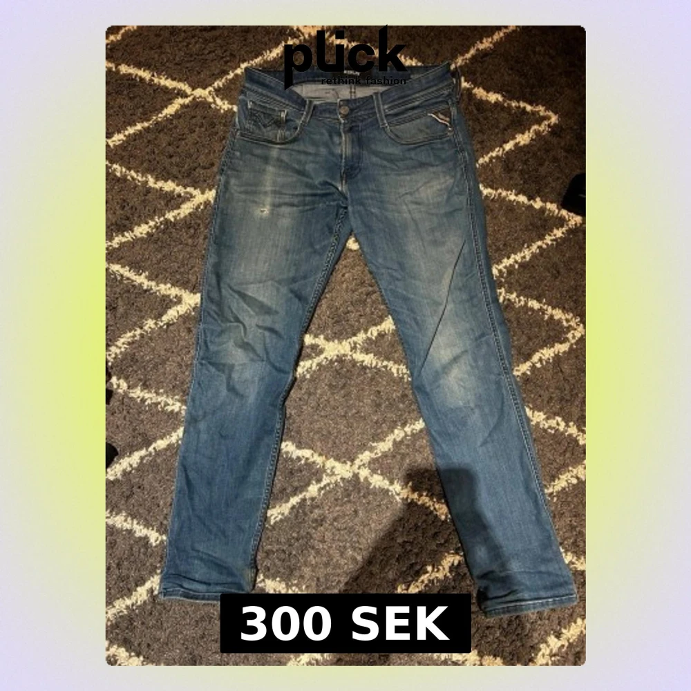 Snygga blå slim fit jeans från Replay med klassisk femficksdesign och diskreta slitningar framtill. Jeansen har dragkedja och knapp i midjan samt detaljerade bakfickor med Replay-logga. Tillverkade i bomull med lite stretch för skön passform. Lite slitna men de syns på bilden