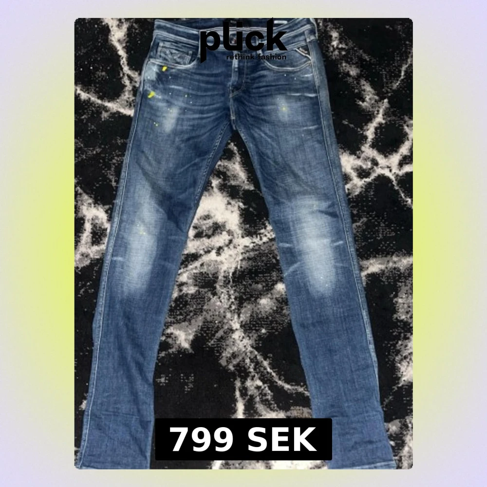 Säljer ett par blå slim fit jeans från Replay med slitningar och ljusa partier på låren. Jeansen har fem fickor, dragkedja och knapp, samt coola färgstänk i gult och vitt för en unik look. Klassisk denim med snygga detaljer och skön passform.