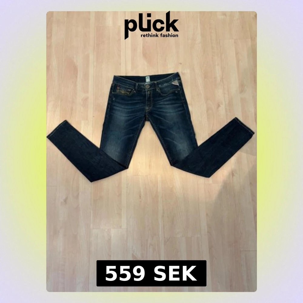 Säljer ett par mörkblå skinny jeans från Replay med snygga slitningar och klassiska fem fickor. Jeansen har låg midja, guldfärgade sömmar och en liten Replay-logga på fickan. Perfekta för en trendig och avslappnad stil.