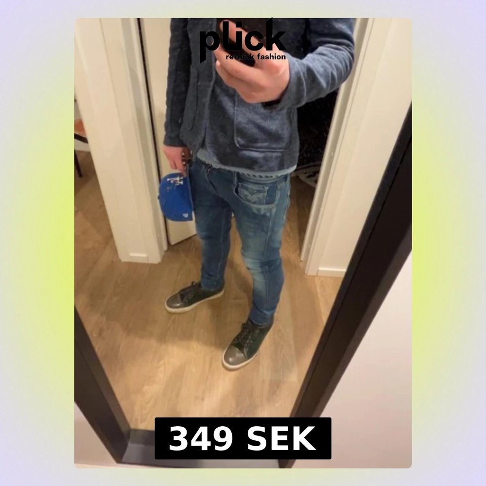 Säljer ett par blå slim fit jeans från Replay med snygga slitningar och tvättade detaljer. Jeansen har klassisk femficksdesign, dragkedja och knapp i midjan samt Replay-logga på fickan. Perfekta för en avslappnad och trendig look.