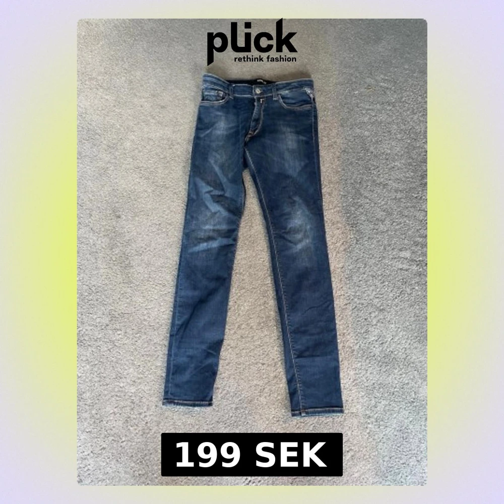 Snygga mörkblå skinny jeans från Replay med klassisk femficksmodell och slitna detaljer på låren. Jeansen har vita kontrastsömmar och metallknapp i midjan. Perfekta för dig som gillar en smal passform och tidlös stil.