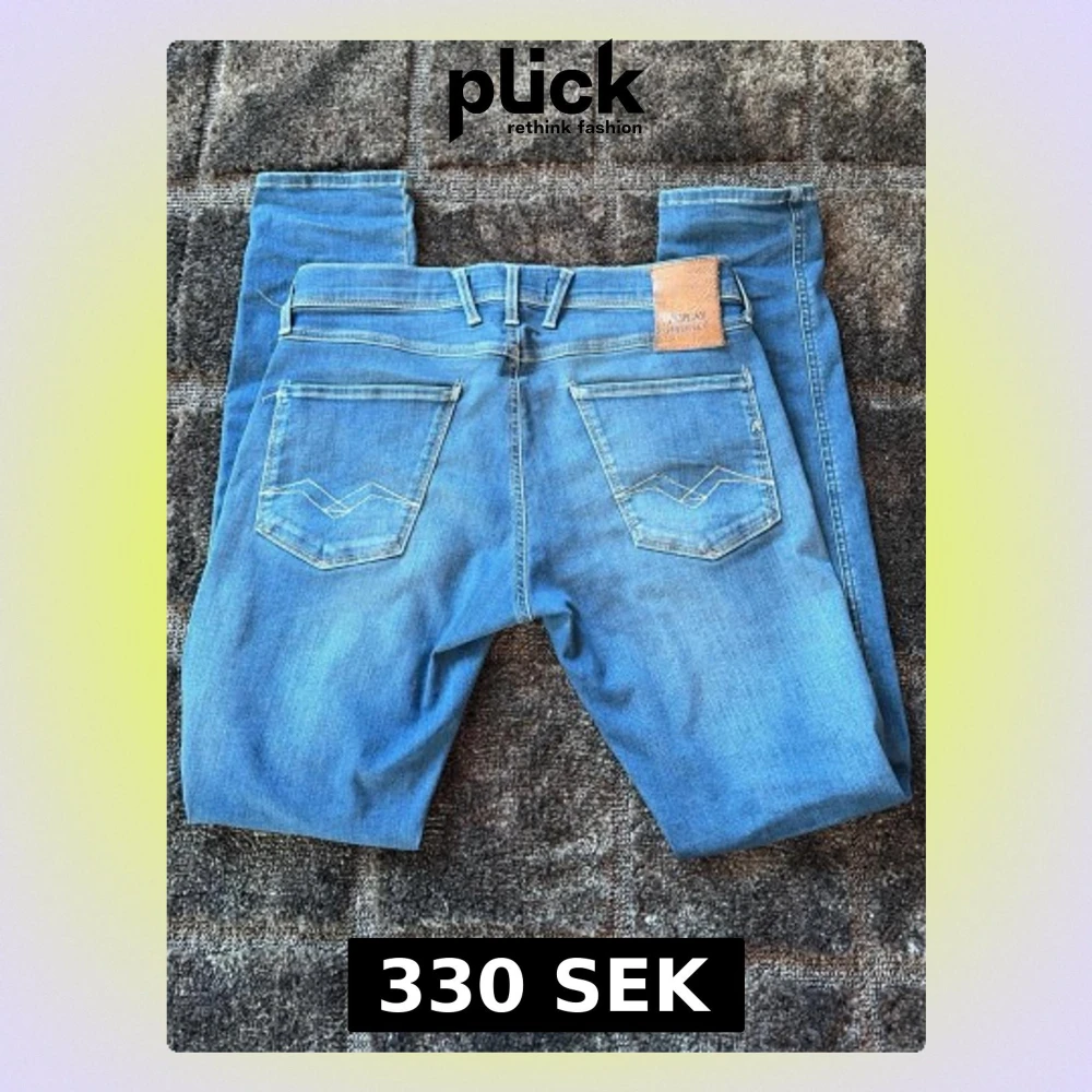 Säljer ett par snygga blå jeans från Replay med klassisk femficksdesign och ljusa slitningar. Jeansen har raka ben och detaljerade bakfickor med broderi. Materialet är mjukt denim som ger en skön passform. Perfekt för dig som gillar stilrena och trendiga jeans.