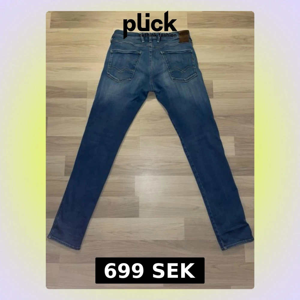 Säljer ett par blå slim fit jeans från replay med klassisk femficksdesign och snygga slitningar framtill. Jeansen har normal midja, bälteshällor och en patch med logga bak i midjan. Perfekta för dig som gillar en smalare passform och tidlös denimstil.