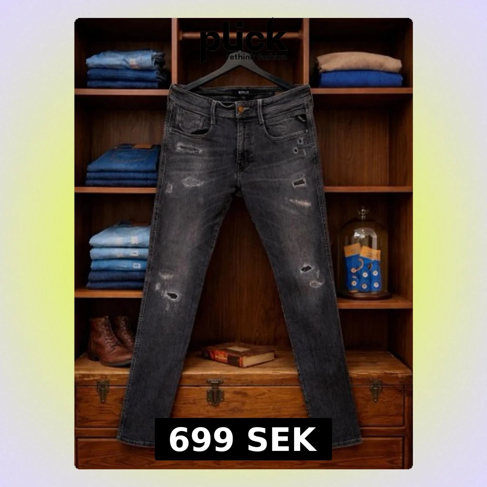 Schyssta replay Anbass med original slitningar. Jeansen har en väldigt schyssta tvätt slitningar. Finns annars inga defekter på jeansen. Mått: W33 Innerlår 82cm Längd 104cm Midja 40cm Benöppning 16cm