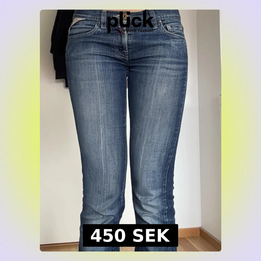 Säljer ett par blå bootcut jeans med snygga slitningar och ljusa tvättade detaljer. Jeansen har klassisk femficksmodell, låg midja och dragkedja med knapp. De är köpta här på Plick.