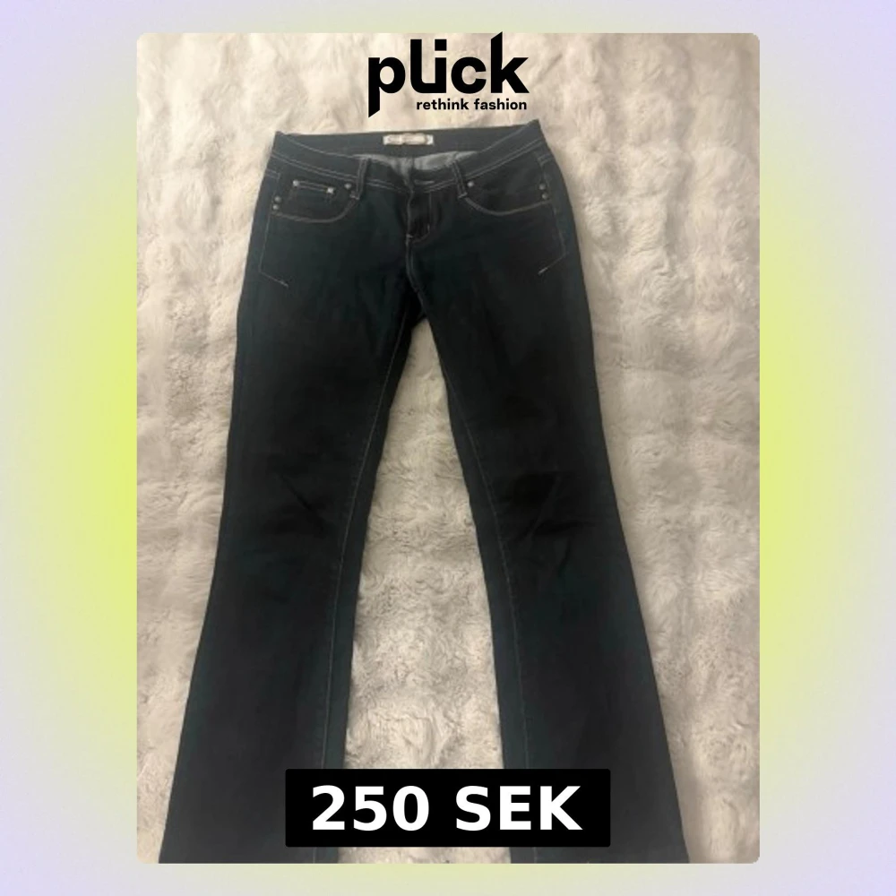 Snygga mörkblå bootcut jeans med vita kontrastsömmar ifrån joom i storlek S!💗 I modellen är de bootcut och lågmidjade. Köpt vinted men mycket bra skick, jag själv har inte använd de!💗💗