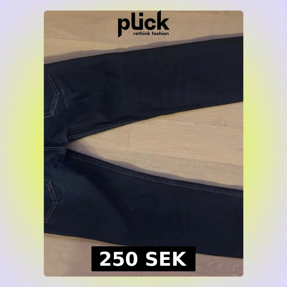 Säljer ett par mörkblå jeans med raka ben och klassiska bakfickor. Jeansen har kontrastsömmar och är tillverkade i ett mjukt denimtyg som sitter snyggt. Perfekta för dig som gillar en enkel och stilren look.