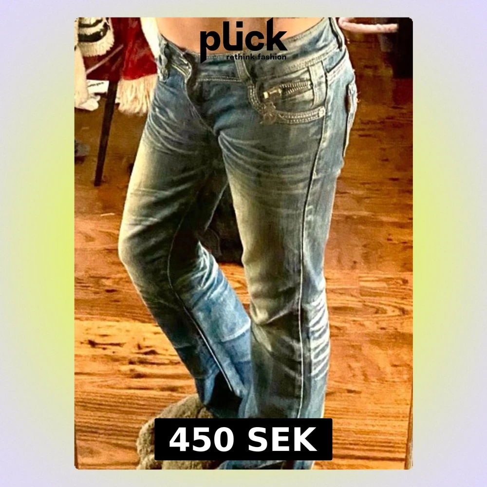 Säljer ett par blå bootcut jeans från Green River med slitningar och detaljerade fickor, inklusive dragkedja och broderad logga bak. Jeansen har låg midja och klassisk femficksdesign. Perfekta för dig som gillar en avslappnad men snygg stil.