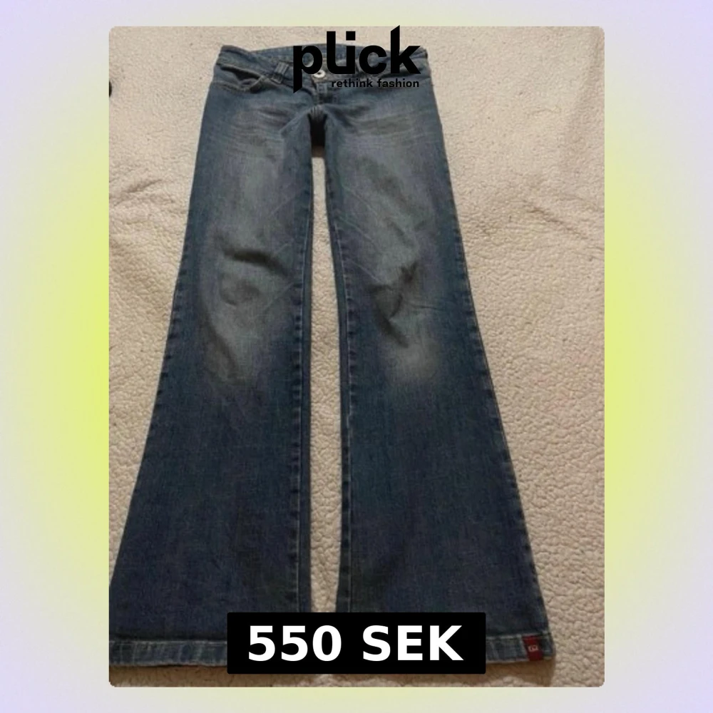 Säljer ett par blå bootcut jeans med låg midja och klassisk femficksdesign. Jeansen har en lätt tvättad look och vida ben. Perfekta för dig som gillar retrostil och vill ha ett par riktigt snygga jeans med skön passform. Strl 28 på lapp