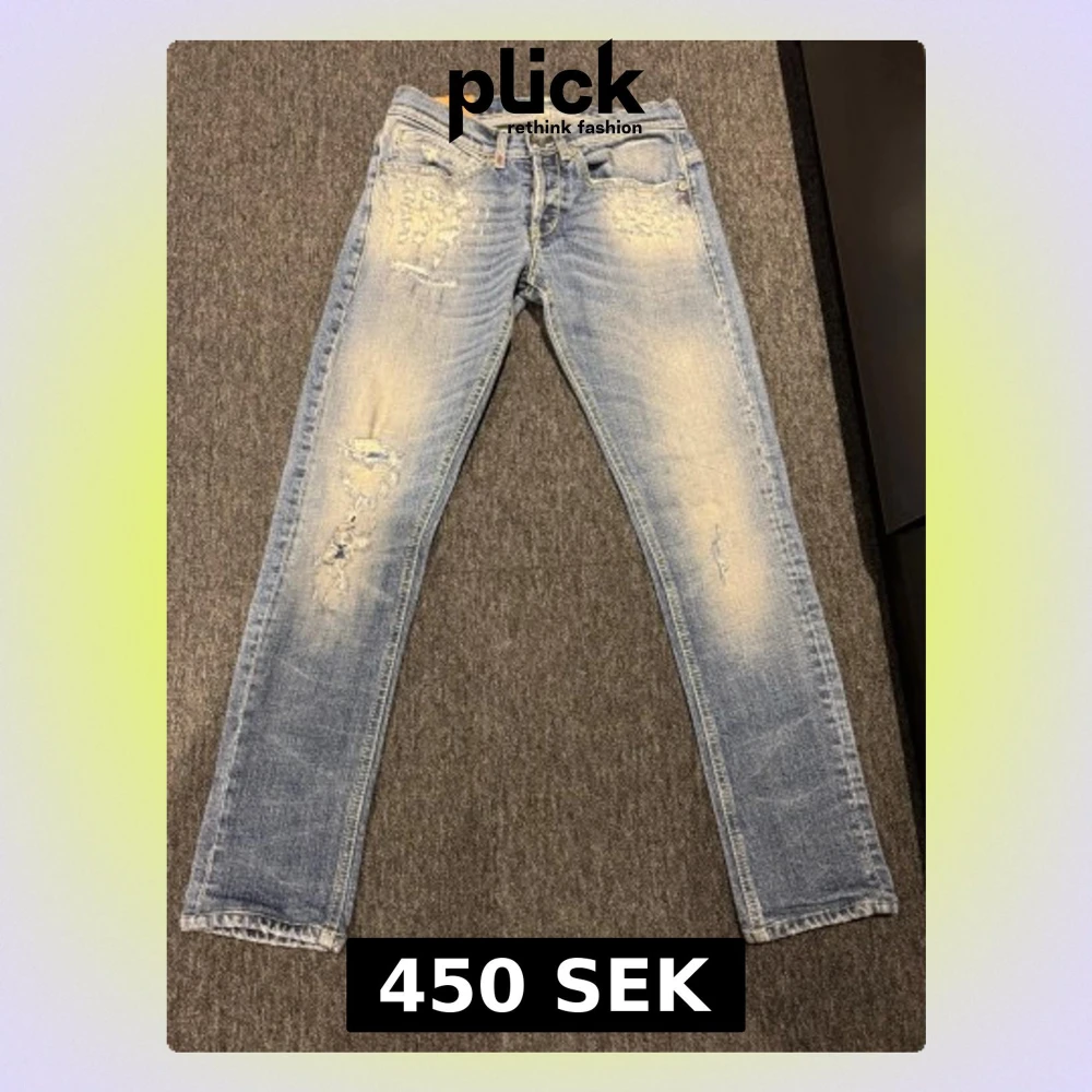 Säljer ett par ljusblå jeans med snygga slitningar och distressed detaljer framtill. Jeansen har raka ben och klassisk femficksmodell. Perfekta för dig som gillar en avslappnad och trendig stil. Materialet är denim i bomull.