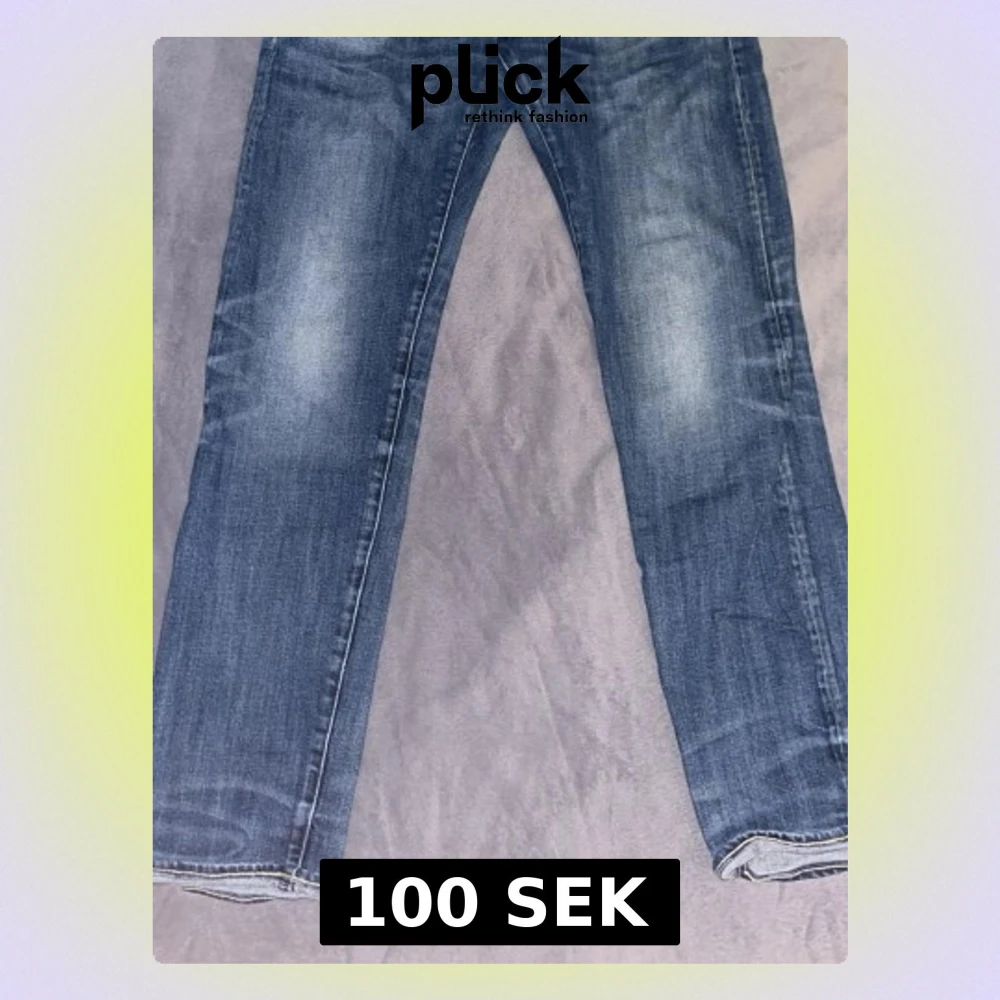 Säljer ett par klassiska blå jeans med raka ben och snygga slitningar på framsidan. Jeansen har fem fickor och kontrastsömmar. Materialet är denim i bomull och de har en tidlös tvättad look som passar till det mesta.