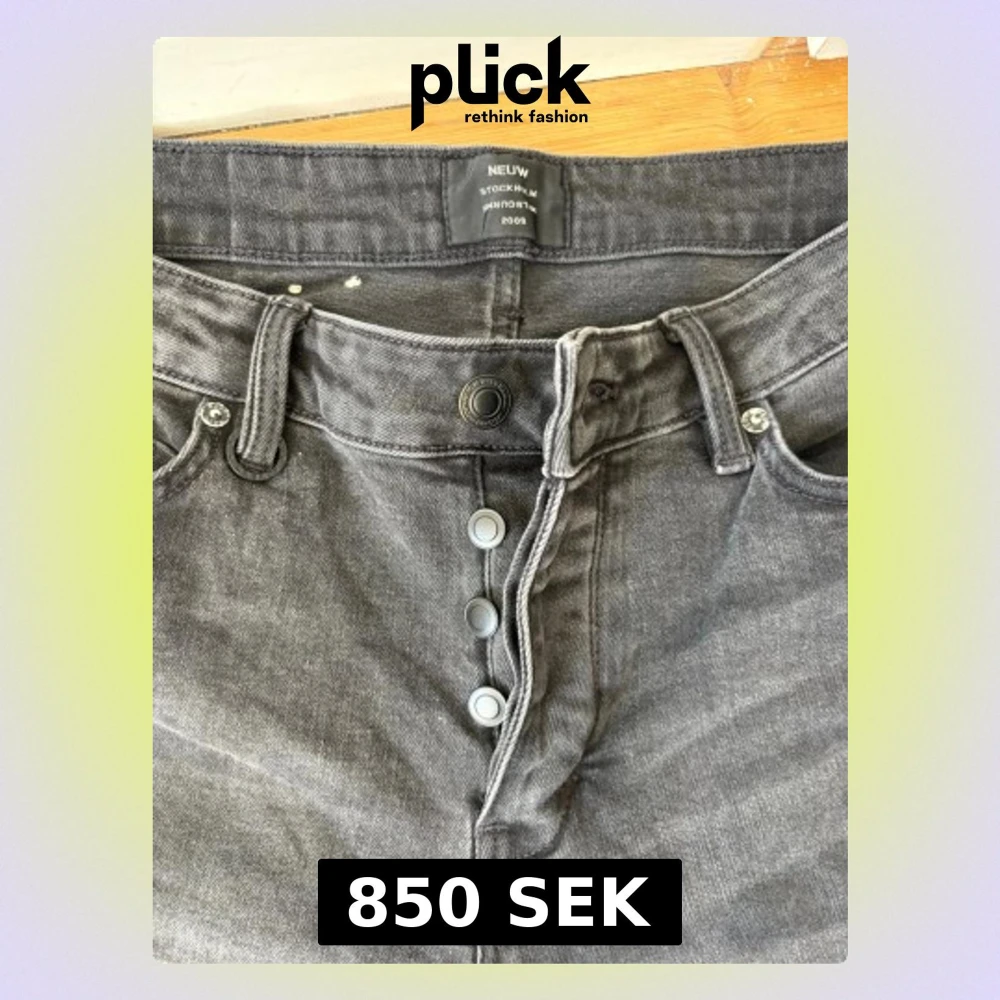 Säljer ett par grå jeans från Neuw med knappgylf och klassisk femficksmodell. Jeansen har en tvättad look och är tillverkade i denim med bälteshällor och silverfärgade knappar. Perfekta för en avslappnad och trendig stil.