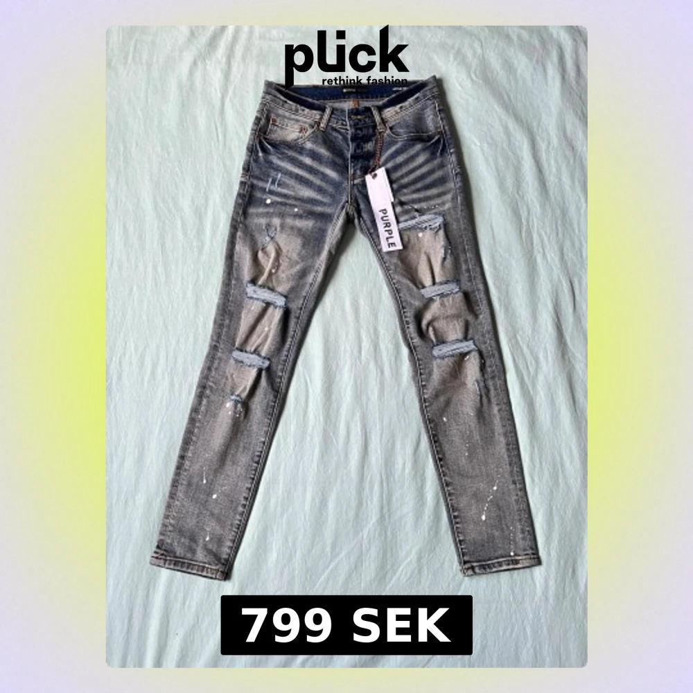Säljer ett par grå skinny jeans från Purple Brand med slitningar och hål på benen samt vita färgstänk. Jeansen har klassisk femficksmodell, dragkedjegylf och cool tvättad look. Perfekta för dig som gillar streetwear och edgy stil.