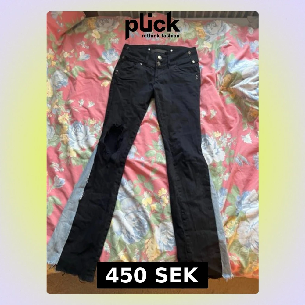 Svarta jeans, har sytt om de själv. Passar både xs och s men sitter snäppet bättre på s skulle jag säga. Bra skick 💘