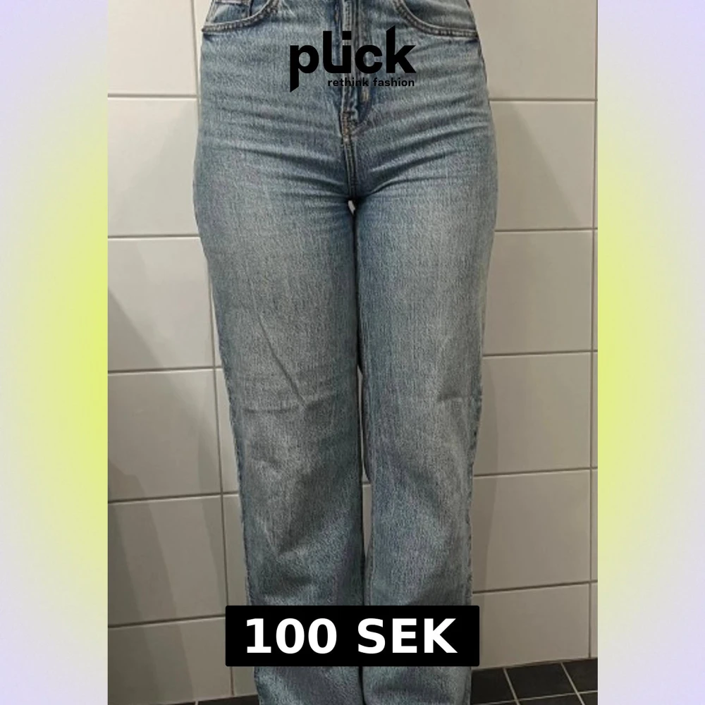 Säljer ett par klassiska blå jeans med rak passform och hög midja. Jeansen har fem fickor, dragkedjegylf och är tillverkade i ett slitstarkt denimtyg. Perfekta för en avslappnad och trendig look.