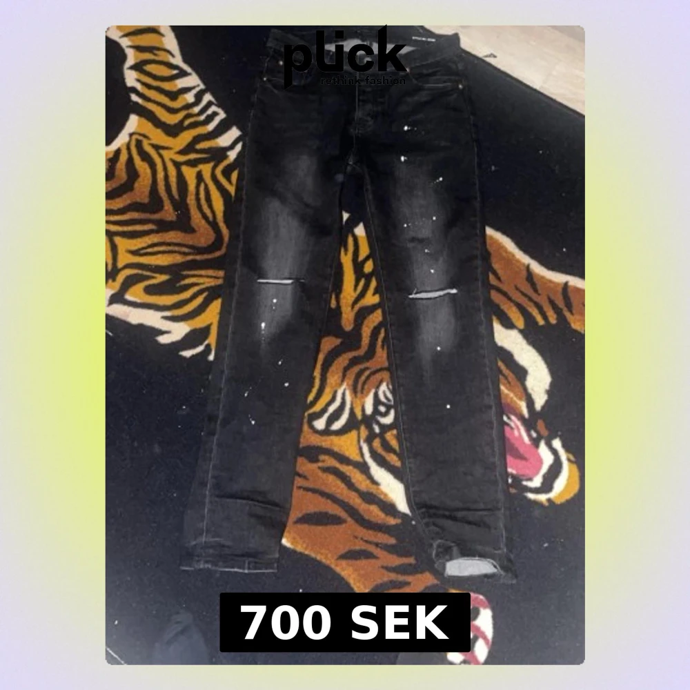 Svarta jeans från Purple Brand med slitningar på knäna och vita färgstänk. Klassisk femficksmodell med raka ben och knappgylf. Jeansen har en cool, streetinspirerad look och är tillverkade i denim.