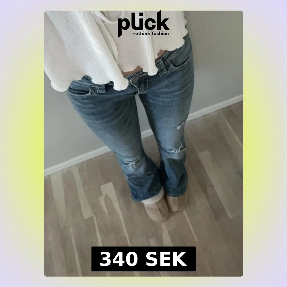 Säljer ett par blå bootcut jeans med låg midja och slitningar på knäna. Jeansen är tillverkade i denim med lätt stretch. Perfekta för en avslappnad och trendig look. Skriv vid funderingar!❤️