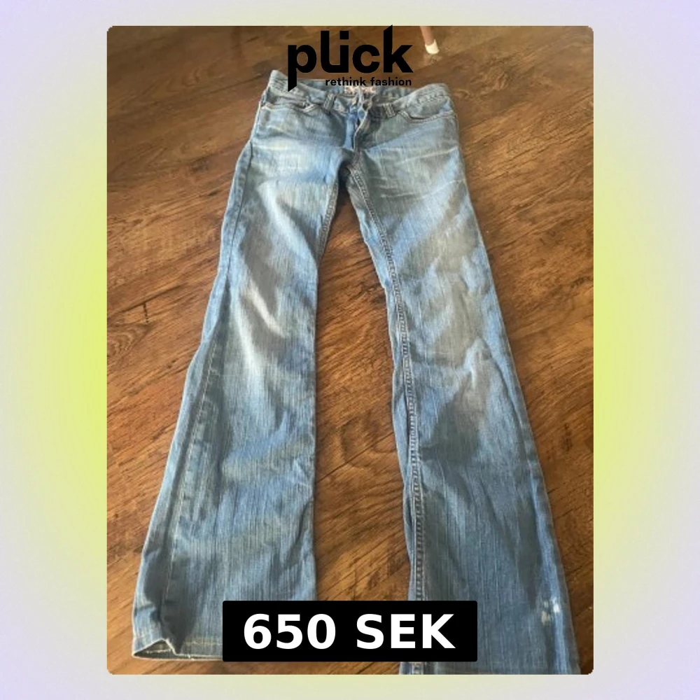 Säljer ett par ljusblå bootcut jeans från Fornarina med klassiska femficksdetaljer och orangea sömmar. Jeansen har en låg midja och är tillverkade i denim med snyggt slitna partier. Perfekta för dig som gillar en avslappnad och trendig look.