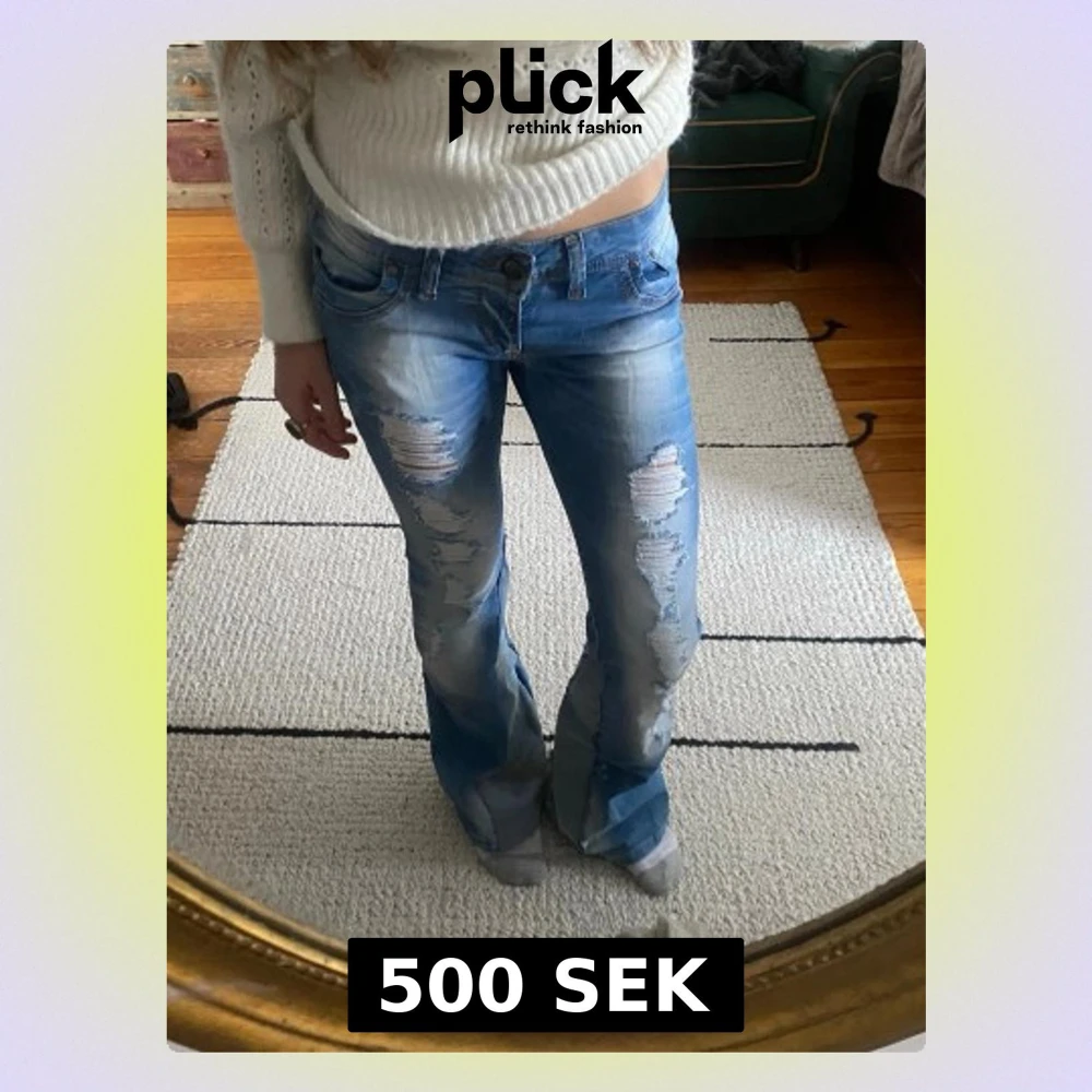 Säljer ett par ljusblå bootcut jeans med slitningar och hål på både fram- och baksida. Jeansen har låg midja, klassiska fem fickor och är tillverkade i denim. Perfekta för en avslappnad och trendig look.
