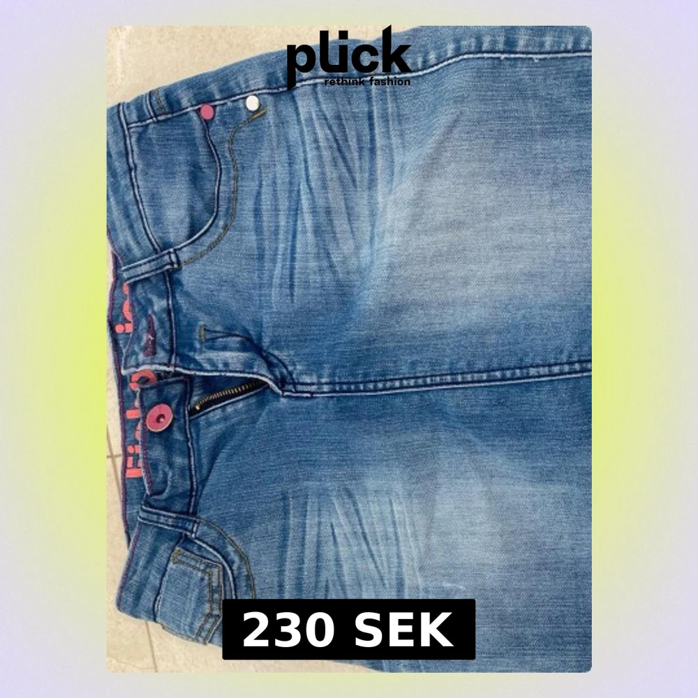 Säljer ett par blå jeans med slitningar och färgade nitar i rosa och gult. Jeansen har klassisk femficksmodell, dragkedja och synliga sömmar. Insidan av linningen har ett rosa tryck. Perfekta för dig som gillar unika detaljer!