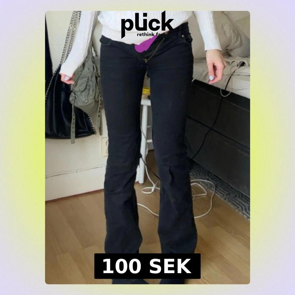 Jättesnygga svarta lågmidjade jeans. Ganska långa, jag som är 174 kan ha dom. De går tyvärr inte att knäppa därav säljning. 💞💞💞