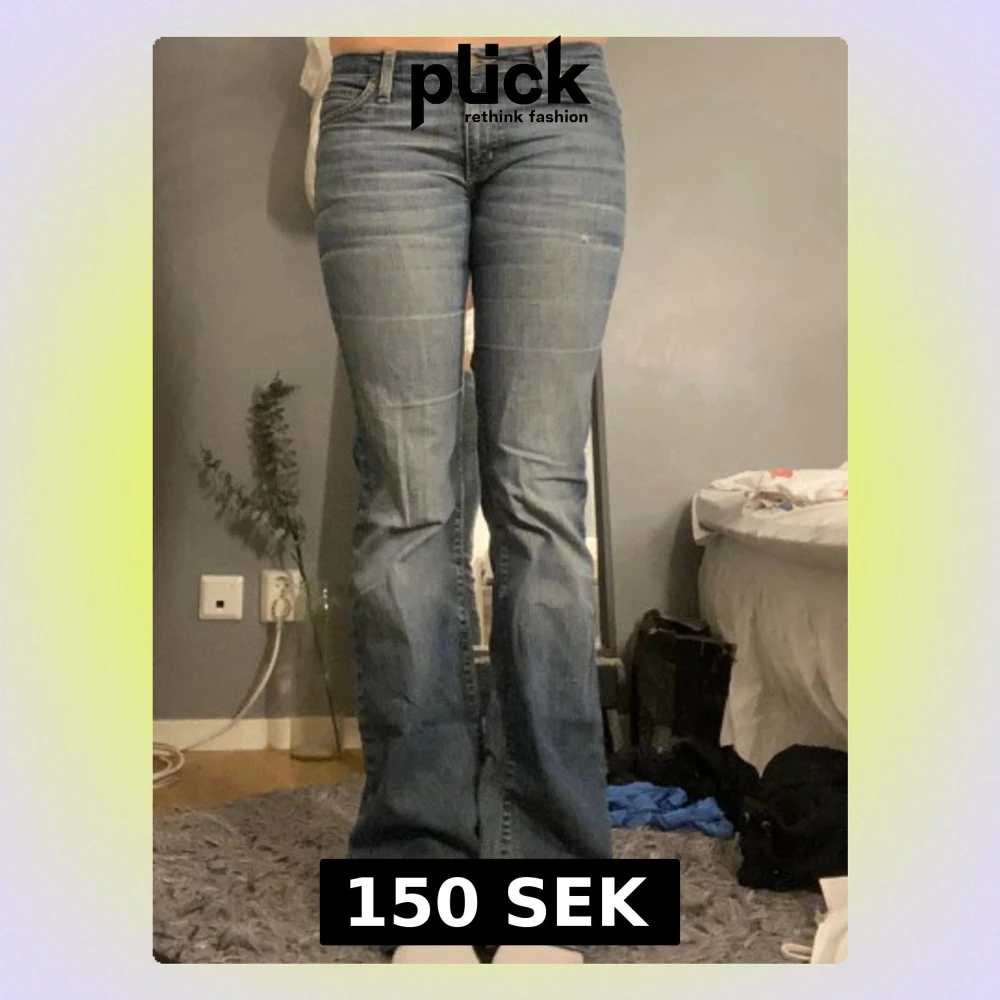 Säljer ett blå lite vintage liknande bootcut jeans med låg midja och femficksdesign. Jeansen har snygga slitningar och ljusa tvättade detaljer på låren. De är tillverkade i denim och har en knapp- och dragkedja framtill.