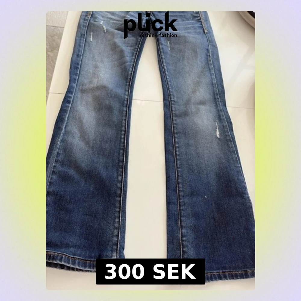 Säljer ett par blå bootcut jeans med snygga slitningar och lätt tvättad look. Jeansen har klassisk femficksdesign och kontrastsömmar. Perfekta för dig som gillar en avslappnad men trendig stil.