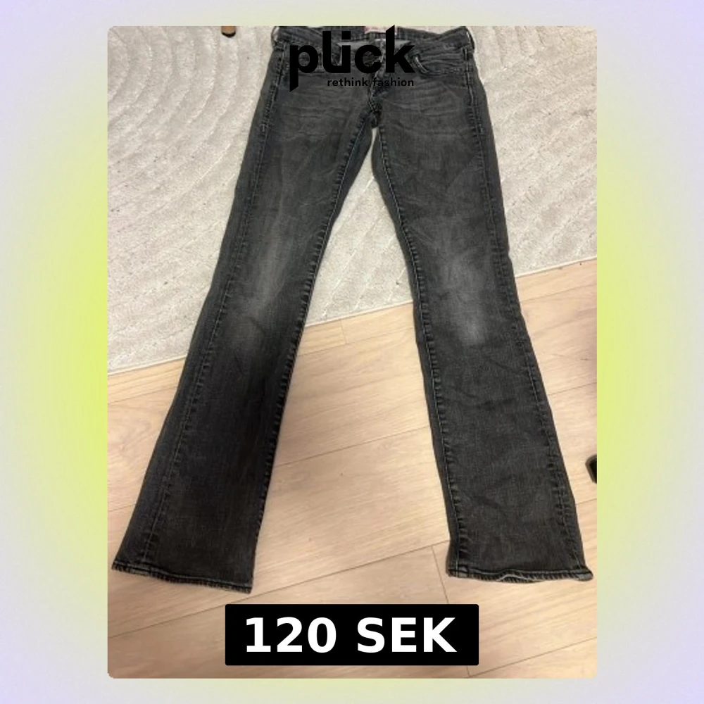 Säljer ett par svarta bootcut jeans med snygga slitningar och tvättade detaljer. Klassisk femficksmodell med dragkedja och knapp. Jeansen har en något utsvängd passform nedtill och är tillverkade i denim med lätt stretch.