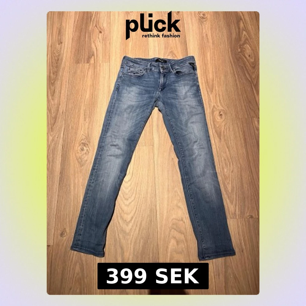 Säljer ett par blå slim fit jeans med snygga tvättade detaljer och klassisk femficksdesign. Jeansen har normal midja och smala ben, perfekta för en avslappnad men ändå stilren look. Passar dig som gillar en modern och enkel stil.