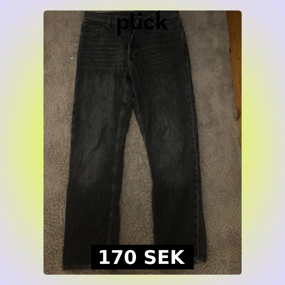 Säljer ett par gråa jeans med rak passform och diskreta slitningar. Jeansen har klassisk femficksdesign och normal midja. Materialet är denim i bomull. Den sista bilden visar hur färgen är under starkt ljus/ blixt. Dom har tappat lite färg nere vid slutet av benen.
