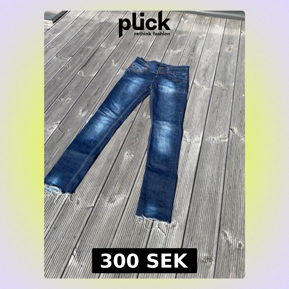 Säljer ett par mörkblå jeans med slitningar och råa, fransiga benslut. Jeansen har klassisk femficksmodell, kontrastsömmar och en smal passform. Perfekta för en avslappnad och trendig look.