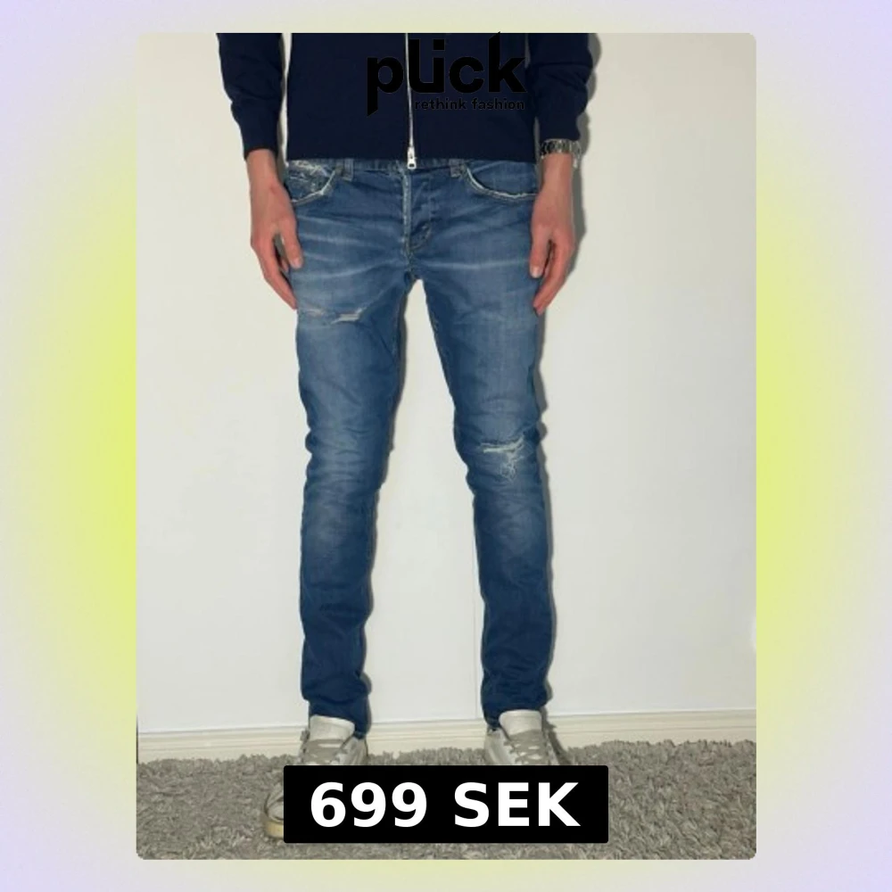 Säljer ett par blå slim fit jeans med coola slitningar och detaljer på benen. Jeansen har klassiska fem fickor och en modern passform som sitter snyggt. Perfekt för dig som gillar en avslappnad och trendig look.