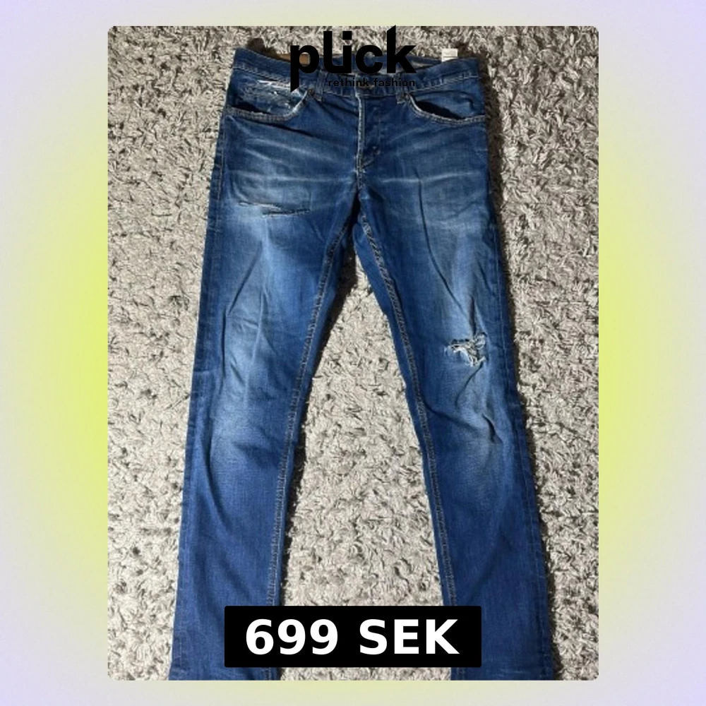 Säljer ett par blå slim fit jeans med coola slitningar och detaljer på benen. Jeansen har klassiska fem fickor och en modern passform som sitter snyggt. Perfekt för dig som gillar en avslappnad och trendig look. Längd: 103 cm midja: 42cm