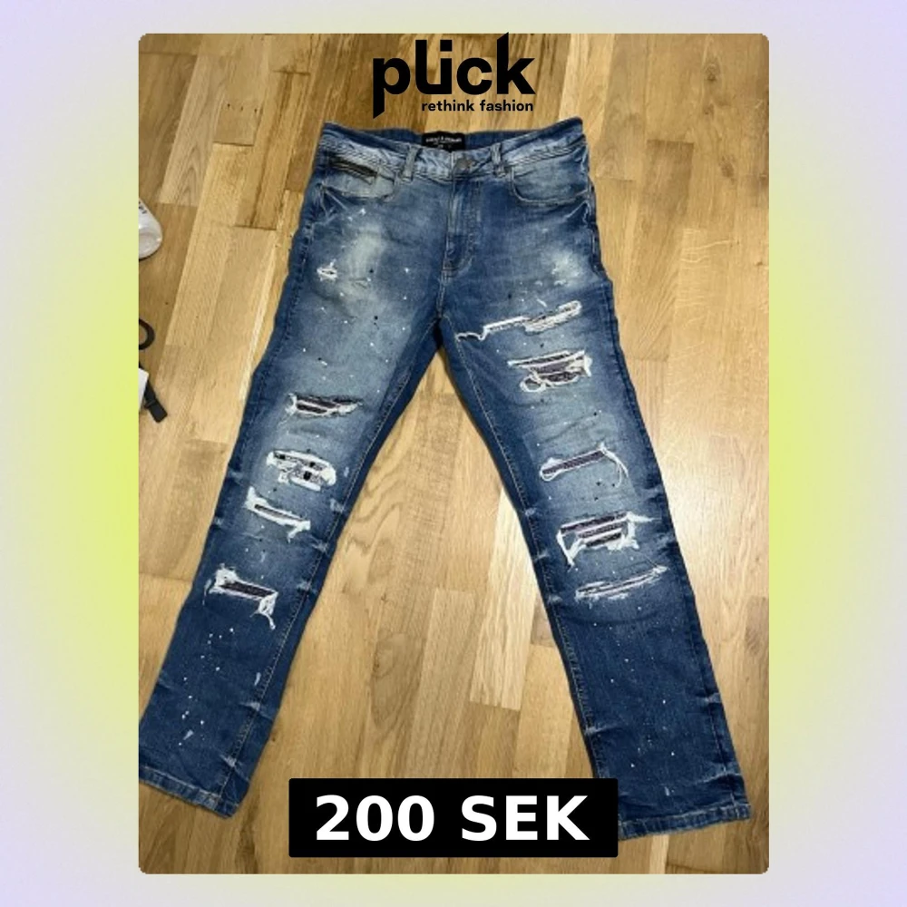 Säljer ett par blå jeans från Only & Sons med kraftiga slitningar och hål på både fram- och baksida. Jeansen har en skinny fit och detaljer med färgstänk för en trendig, avslappnad look. Klassisk femficksmodell och knappgylf.