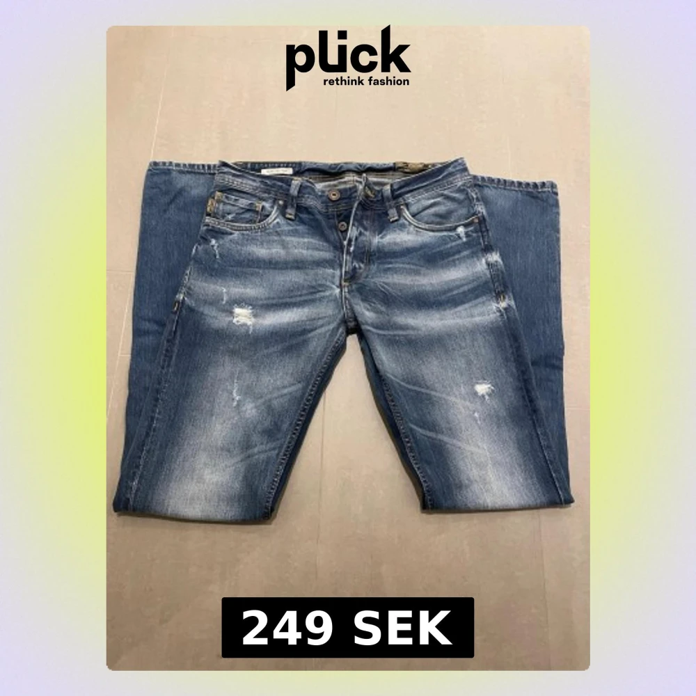 Säljer ett par blå jeans med slitningar och snygg tvätt. Jeansen har knäppning med flera knappar framtill, fem fickor och kontrastsömmar. Bakfickorna har dekorativa sömmar och det finns en läderpatch i midjan. Perfekta för en avslappnad stil. Jeansens storlek står inte i men jag skulle säga att dom är 30/32. Dom har ett väldigt bra pris men går att diskutera. Skriv vid minsta fundering!!🤩🤩