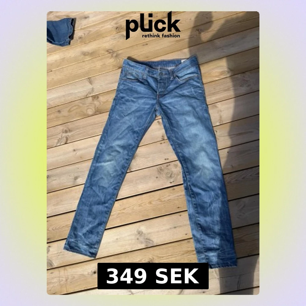 Säljer ett par blå jeans med raka ben och snygga slitningar. Jeansen har klassisk femficksdesign och ljusare partier på låren och knäna. Materialet är denim och passformen är slim fit. Perfekt för dig som gillar en avslappnad och trendig look.