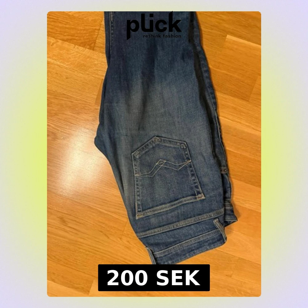 Säljer ett par blå jeans med raka ben och snygga slitningar framtill. Jeansen har klassisk femficksdesign och kontrastsömmar på bakfickan. Materialet är denim i bomull och de har en avslappnad passform.