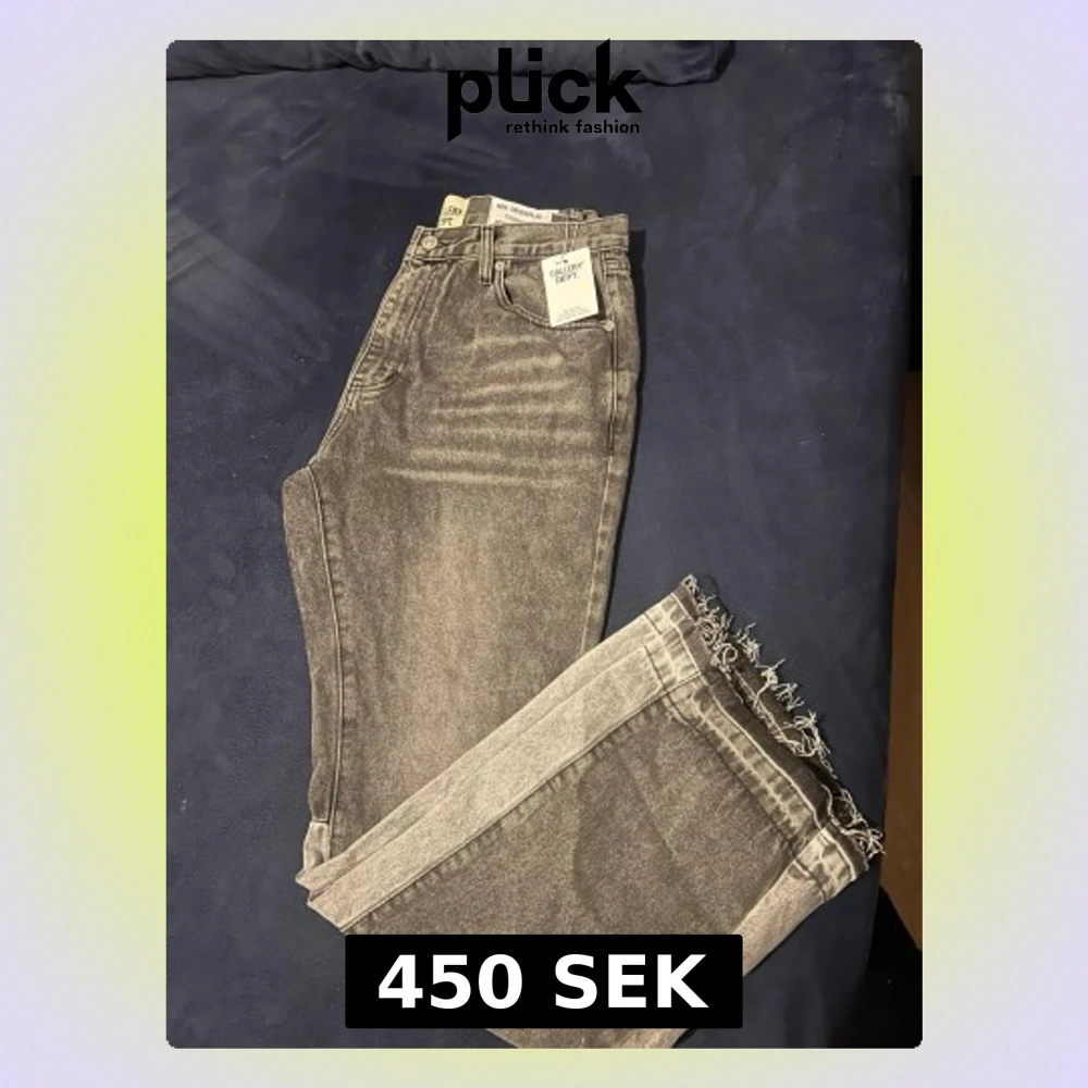 Unika grå jeans från Gallery Dept med tvättad look och råa, fransiga kanter ovanför knäna. Jeansen har fem fickor, raka ben och cool patchwork-detalj på baksidan. Perfekta för dig som gillar streetwear och vill sticka ut.