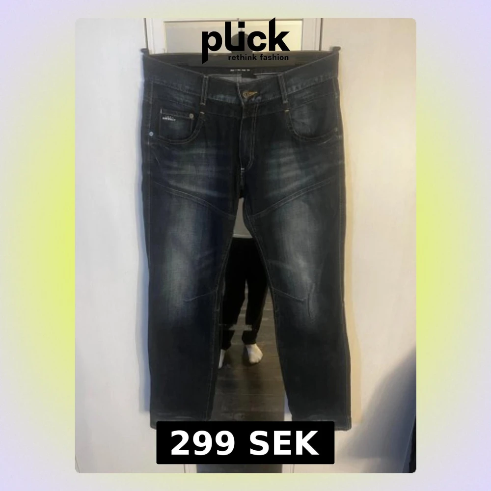 Säljer ett par mörkblå jeans från Grant, modell 989. Jeansen har snygga slitningar och kontrastsömmar i gult. Klassisk femficksmodell med raka ben och detaljerade sömmar över låren. Perfekta för en avslappnad och trendig look. Hör av er vid frågor! W33 L32