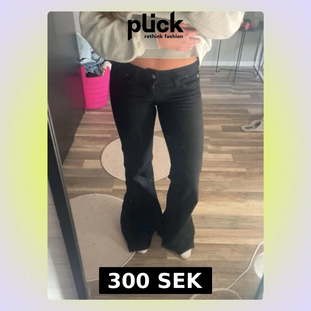 Säljer ett par svarta bootcut jeans med låg midja, från weekday. Helt oanvända men är tyvärr för långa på mig som är 160cm, i storlek 26/32.